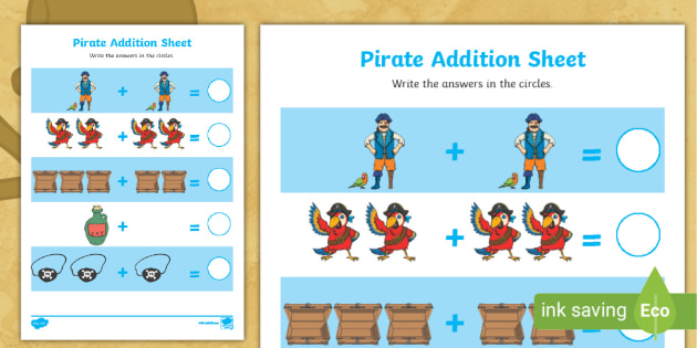 Pirate Math Worksheet | Teachers Pay Teachers PDF. These 8 Pirate themed Math Worksheets include 4 pages of Basic Addition and 4 pages of Basic Subtraction (answers vary from 0-10). They're a fun and easy way to introduce early learners to addition and subtraction, great for distance learning or homeschool workbooks. NO PREP - Just download the PDF.
