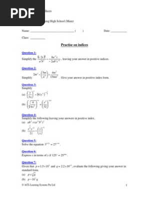 Secondary 3 Mathematics Worksheet - Indices [on2360858ml0] Worksheet on Indices (b) Hence, or otherwise, express 20 3 n 1 as a fraction in its simplest form. 3 n 3 7 3 n Question 18: Given that 2x(125) = 10y(16), write down the value of x and of y. Question 19: (9 p 4 ) 0 ( 3 p) 4 Simplify and express in positive index form. (9 p) 2 5 p 8 Question 20: Simplify and express
